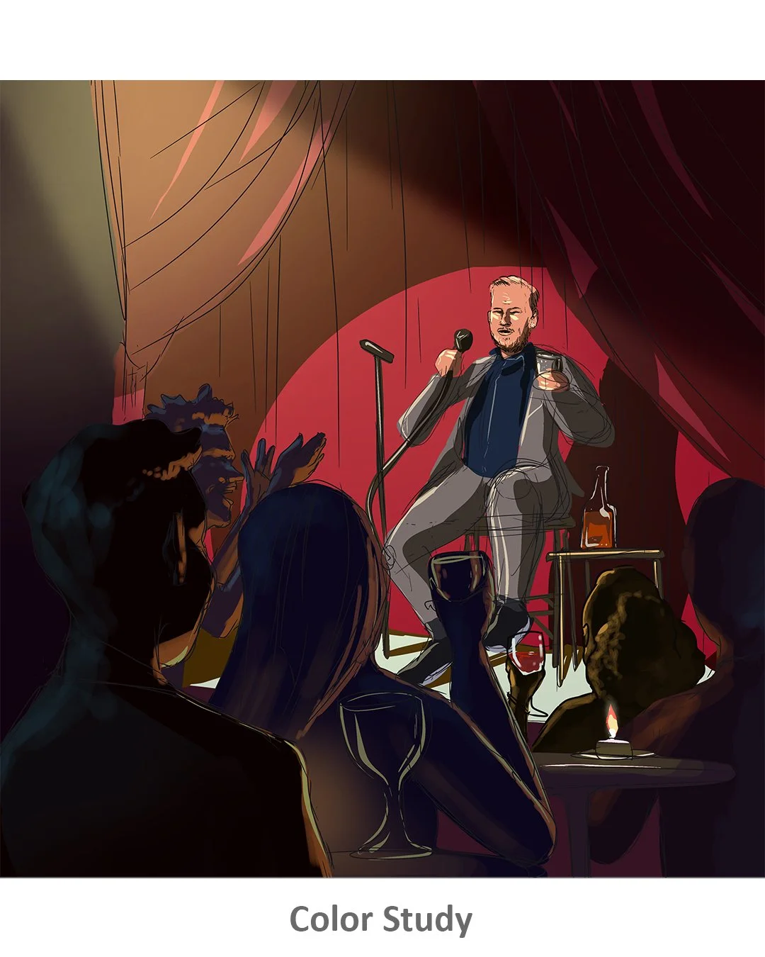 Editorial illustration featuring Jim Gaffigan for a Q&A article touching on his new brand of bourbon and his love for the spirit. Featured is the final illustration, as well as the initial sketch and color study.