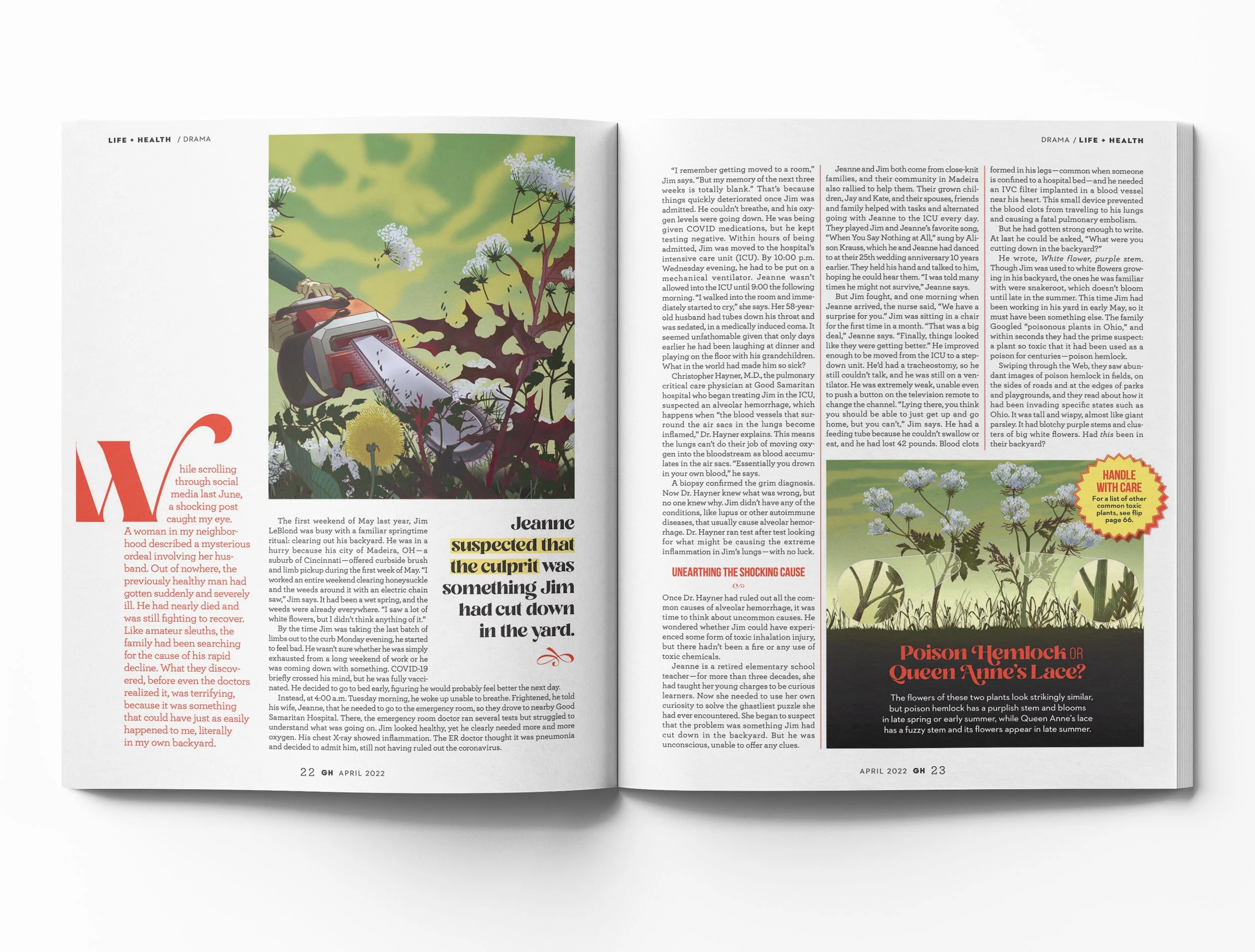 Editorial illustrations for Good Housekeeping’s “Life + Health” section. The editorial was about the prevalence and dangers of poison hemlock. The creative brief was to make a seemingly ordinary backyard into an ominous, eerie, and poisonous place.